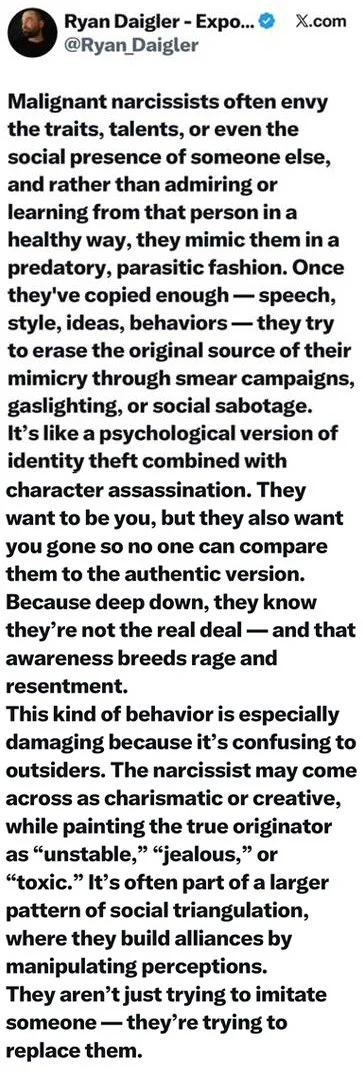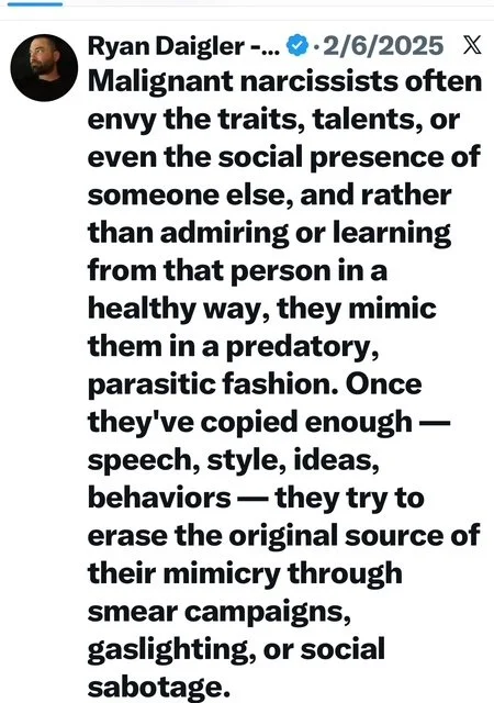 ‘Malignant narcissists often envy the traits, talents or even social presence of someone else and rather than admiring or learning from that person in a healthy way, they mimic them in a predatory, parasitic fashion. Once they have copied enough - speach, style, ideas, behaviours - they try to erase the original source of their mimicry through smear campaigns, gas lighting, or social sabotage.’
