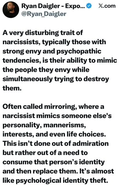 ‘A very disturbing trait of narcissists, particularly those with strong envy and psychopathic tendencies, is their ability to mimic the people they envy/hate while simultaneously trying to destroy them.’