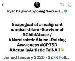 Daigler claims on multiple social media platforms that he is the sad, abused victim of 2 psychopath parents who tried to kill him, and a psychopath brother who terrorised him. (He also refers to his family members as malignant narcissists, narc/sociopaths, covert narc/sociopaths, NPD, ASPD and other terms.)