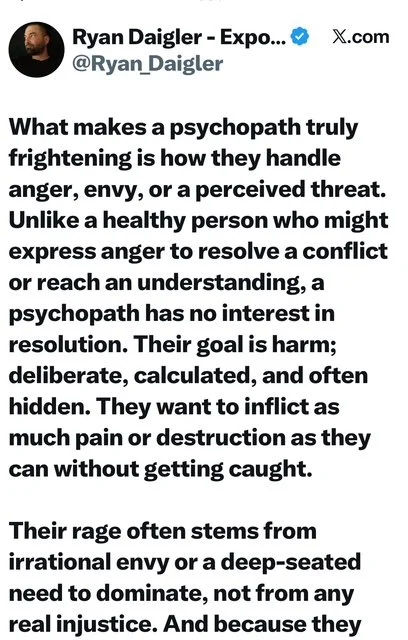 ‘What makes a psychopath truly frightening is how they handle anger, envy, or a perceived threat….Their goals is harm; deliberate, calculated, and often hidden. They want to inflict as much pain or destruction as they can without getting caught.’