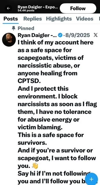 Around Feb 2025 Daigler suddenly changed the direction of his public posting from being singularly about his own alleged experiences as a scapegoat child of allegedly psychopath parents, to positioning himself as an expert on all things narcissist and psychopath. His style of writing became substantially more sophisticated; he started using terminology and concepts that were evidently borrowed from others to more effectively position himself as an expert and he began making overtures about writing books and increasing his appeal to others to support him in creating a Netflix series or similar.